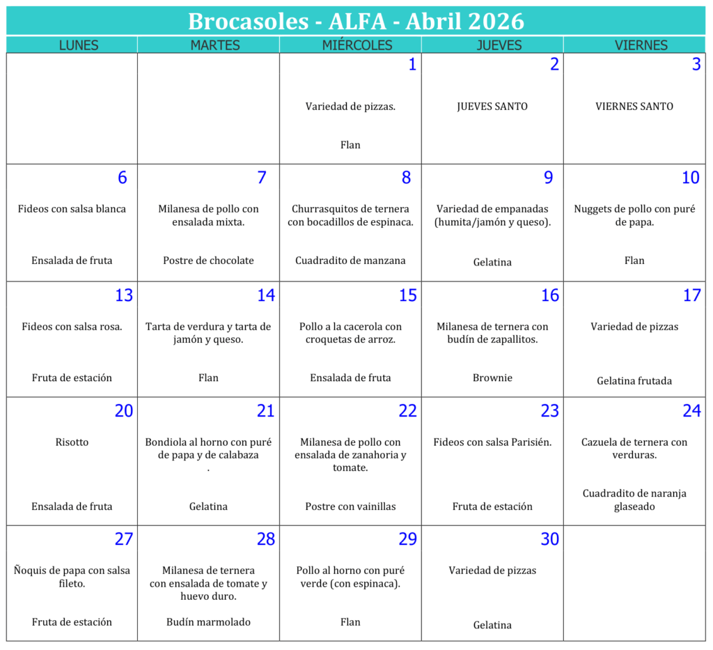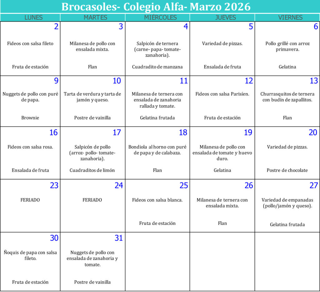 Planificación mensual correspondiente a un régimen normal. En caso de requerir un menú especial será necesario presentar con antelación certificado médico que prescriba el tipo de alimentación y patología presente del niño para poder ofrecer un menú adaptado. Visitando www.solesgastronomia.com.ar encontrará consejos nutricionales